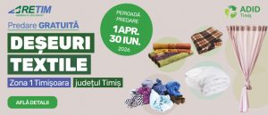 RETIM Ecologic Service S.A., in parteneriat cu ADID Timis, anunta cea de-a doua campanie trimestriala pentru predarea gratuita a deseurilor textile, in Zona 1 Timisoara, jud. Timis. Utilizatorii casnici se pot debarasa legal si GRATUIT de deseurile textile din gospodarie.