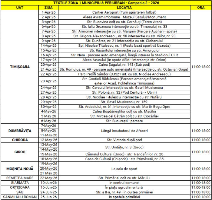 Campania se desfasoara in perioada 01 aprilie – 30 iunie 2026, in localitatile: Timisoara, Dumbravita, Ghiroda, Giroc, Mosnita Noua, Remetea Mare, Sanandrei, Sandra, Becicherecu Mic, Biled, Bucovat, Carpinis, Cenei, Checea, Dudestii Noi, Fibis, Foeni, Giarmata, Giulvaz, Iecea Mare, Masloc, Ortisoara, Otelec (si in Iohanisfeld), Parta, Peciu Nou, Pischia, Sacalaz, Sag, Sanmihaiu Roman, Satchinez, Uivar si Varias.