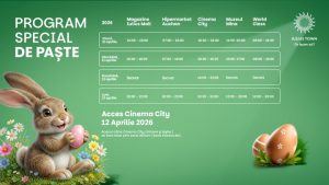 Sambata, si Cinema City este deschis de la 10,30 pana la 16,30. In prima zi de Paste, poti sa vii impreuna cu cei dragi sa va bucurati de magia filmelor, in intervalul 14 – 23. Luni, orarul Cinema City este de la 10,30 – 23.