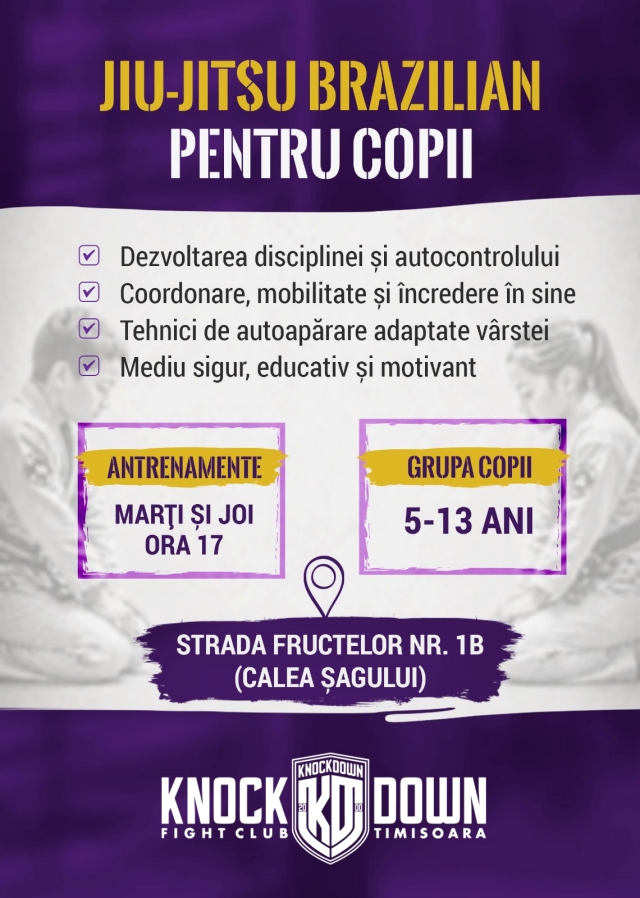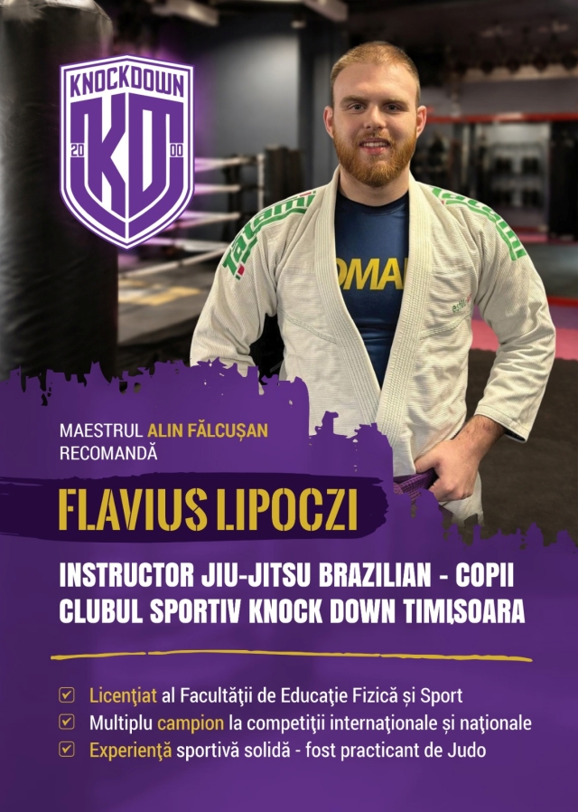 Sa mai spunem ca, din acest an, instructorul Flavius Lipoczi colaboreaza cu maestrul Alin Falcusan si tine cursuri de jiu-jitsu brazilian in sala clubului Knock Down din Timisoara, str. Fructelor 1B, in Calea Sagului, antrenand copii cu varste cuprinse intre 5 si 13 ani. (C.R.)